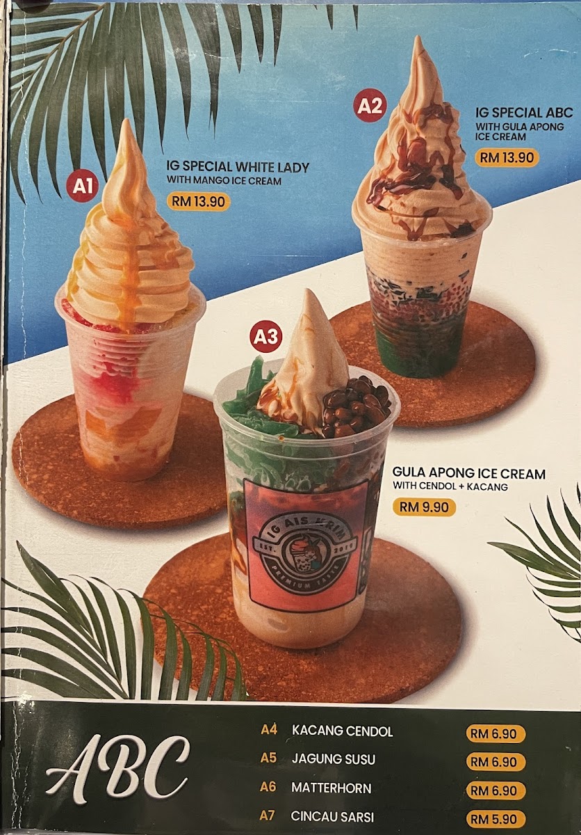 One of the standout items on the menu is their iconic Ais Kacang, renowned for its perfect balance of sweetness, texture, and fresh ingredients. Customers rave about the Cendol and the indulgent White Lady Mango, which uphold the brand's promise of quality. Reviews highlight the seamless combination of flavors, ensuring nothing overwhelms the palate.